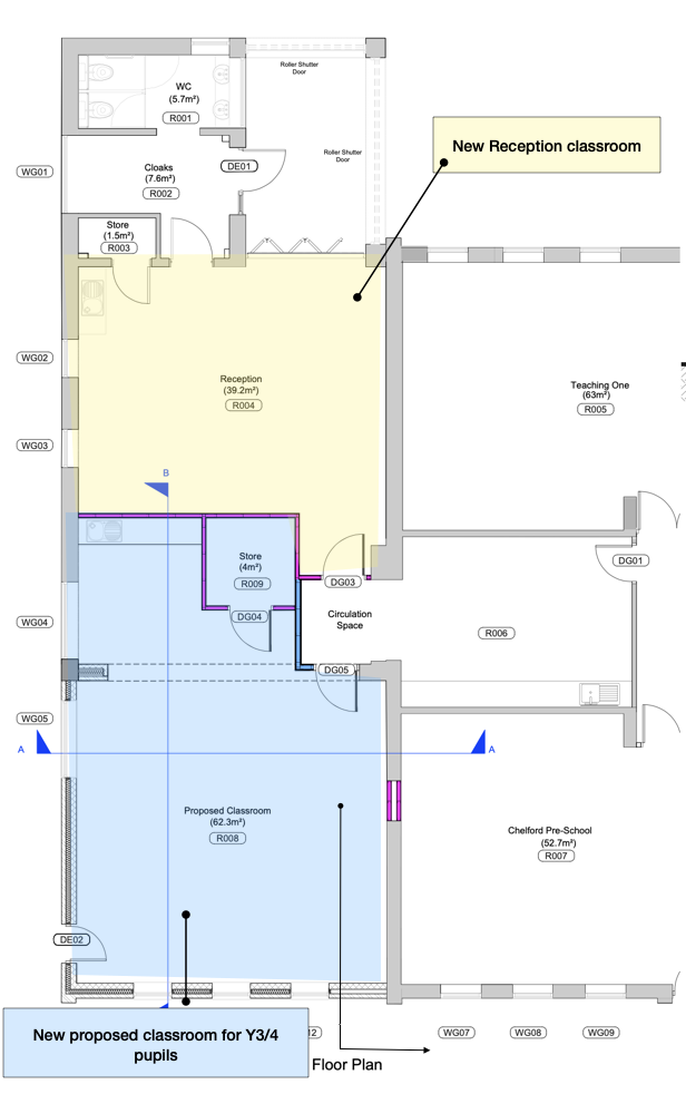 Given the rationale for the project and working within tight budgetary constraints and our existing accommodation, the design for the new classroom includes reducing the size of the existing Class 1 room, which will become a discrete Reception classroom for 13 pupils. This will be achieved by constructing a new internal wall and removing the existing south facing external wall. This will then create the space for a new, suitably-sized classroom to be constructed where the existing outdoor learning provision for Chelford Village Pre-School is based.