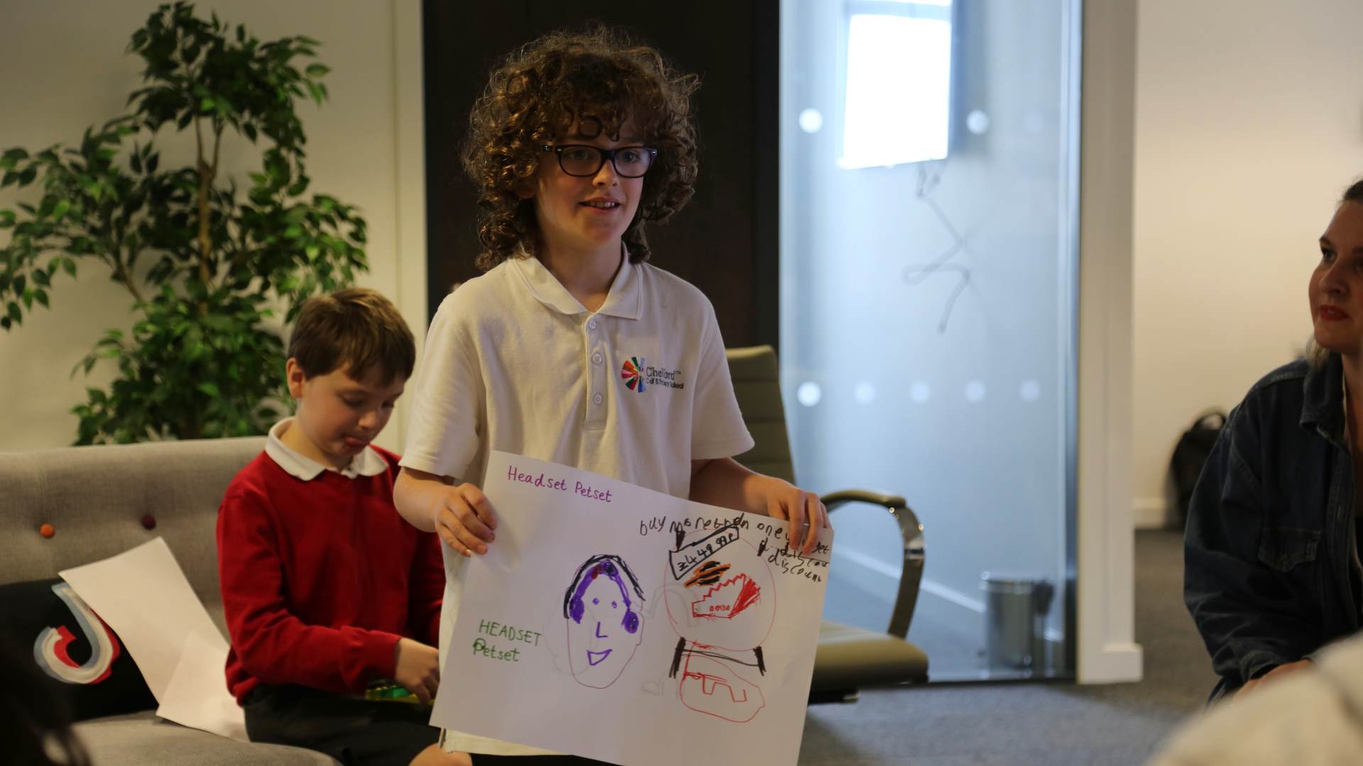 In the second ‘Dragons’ Den’ workshop, children had to devise and present their own invention to two ‘Dragons’. Alice and Rose’s innovate watch design enables wearers to choose their own outfits and make-up via the watch which is then automatically applied - saving time in the morning! Rory and Jasper’s ‘Headset Petset’ was designed specifically to enable someone who may be paralysed or affected by disability to interact with their pet via VR headsets. Pets would wear a special suit and the wearer of the headset could control the activity through head movements - making it possible to take their dog for a walk simply through head and eye movements!