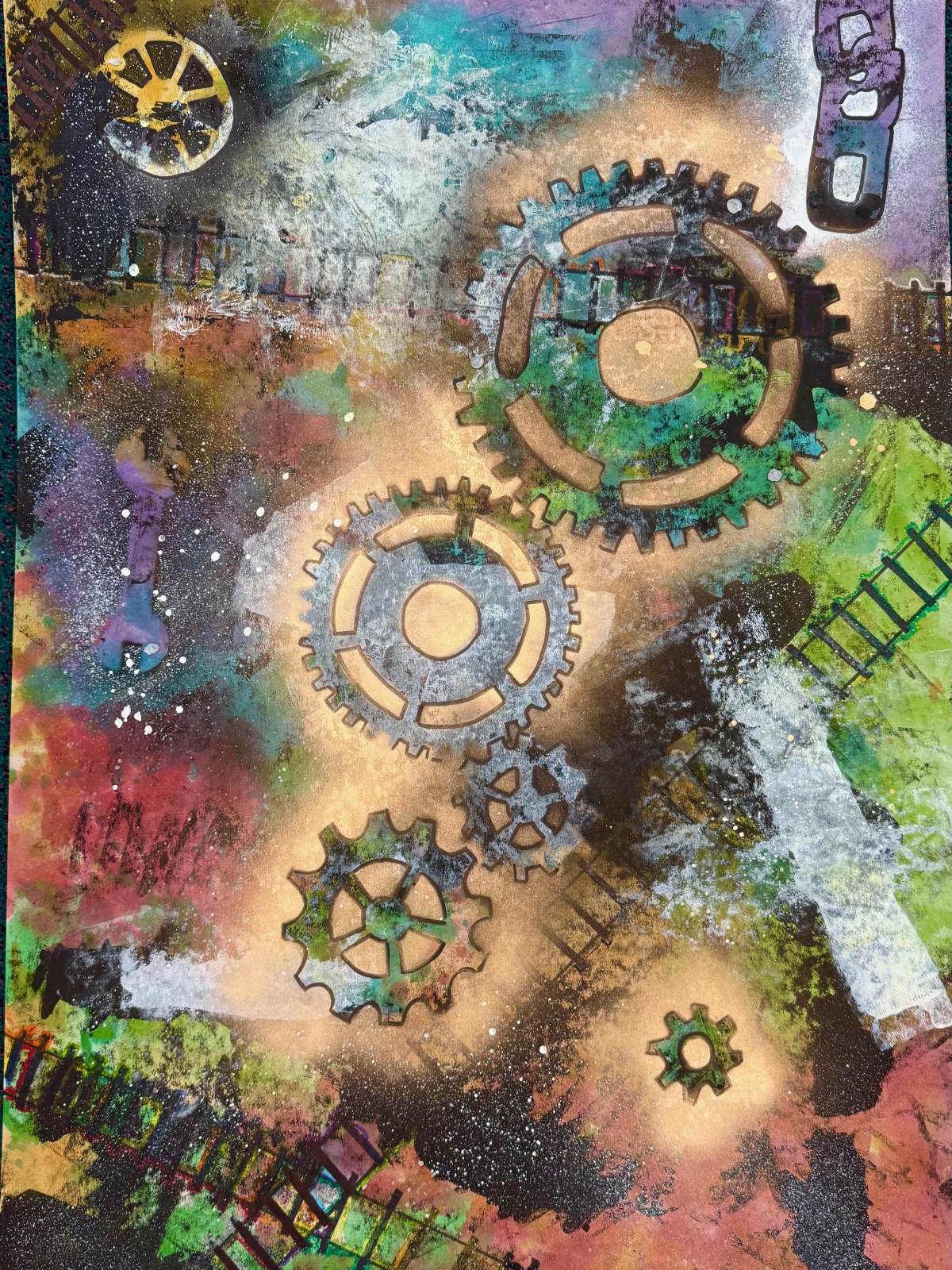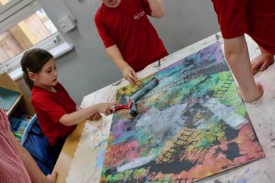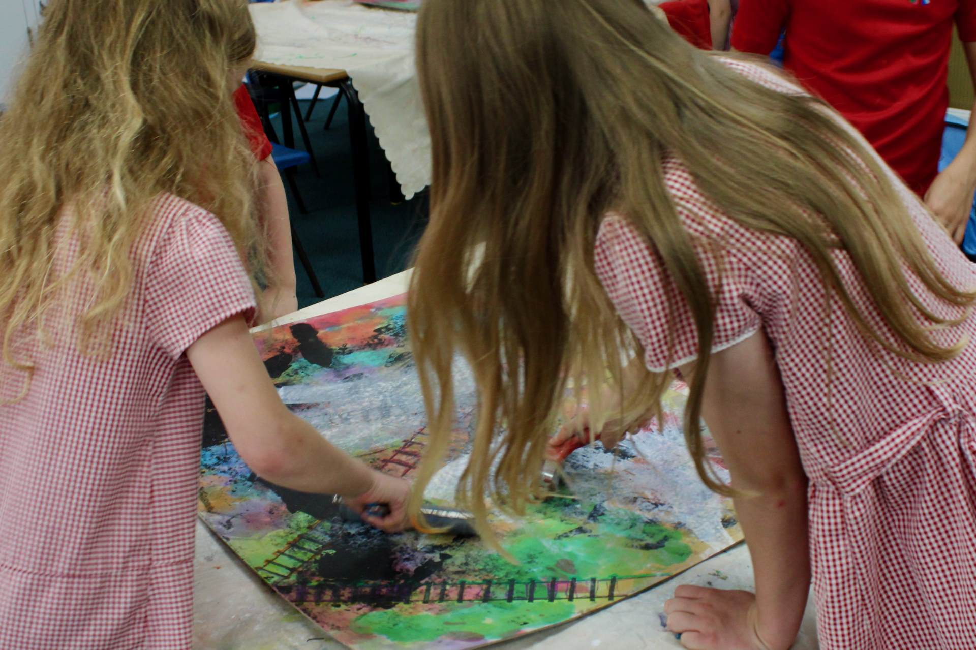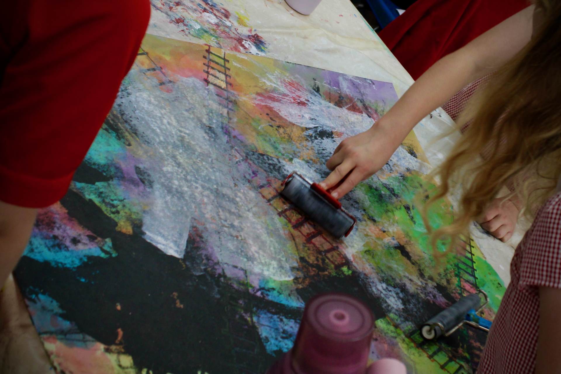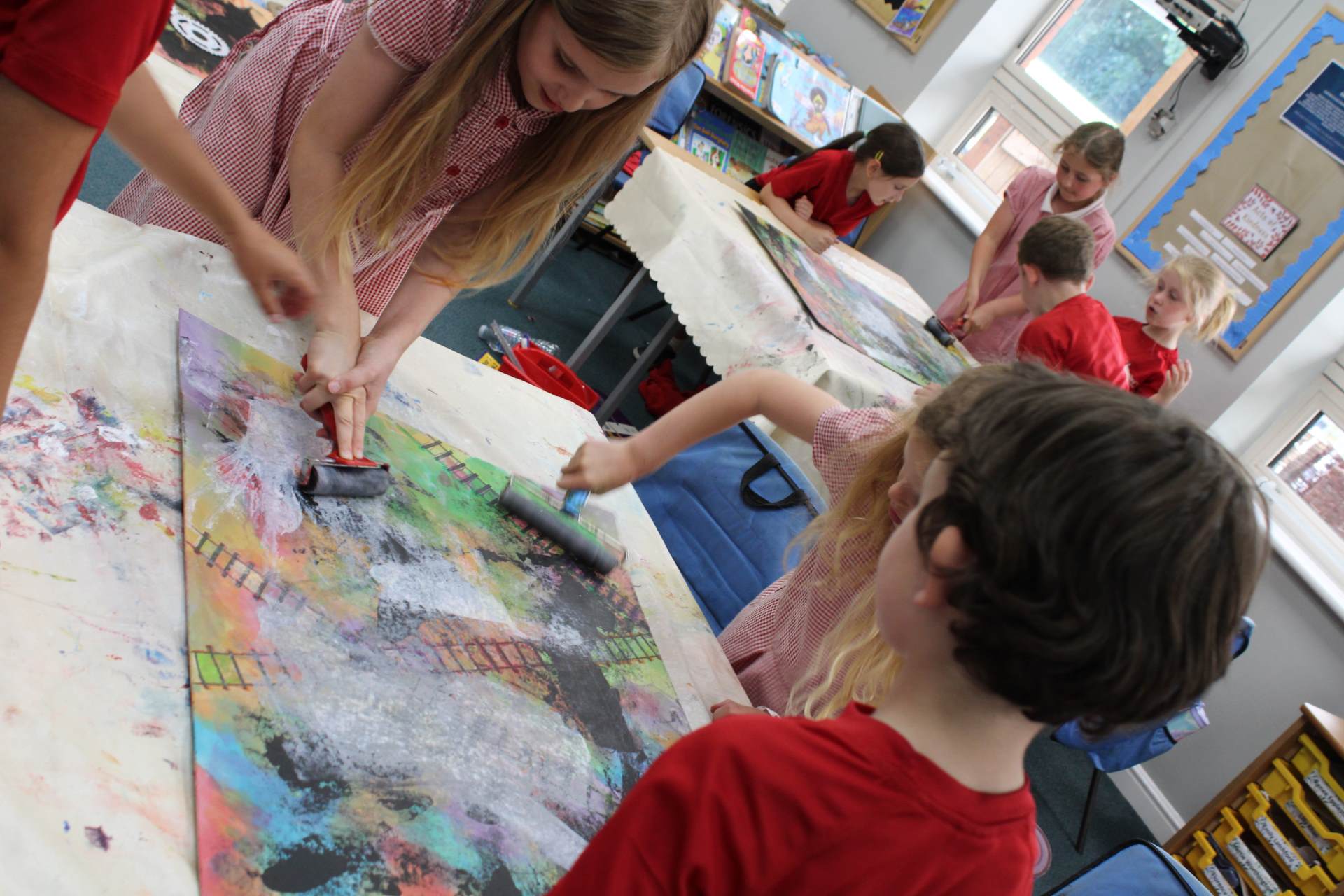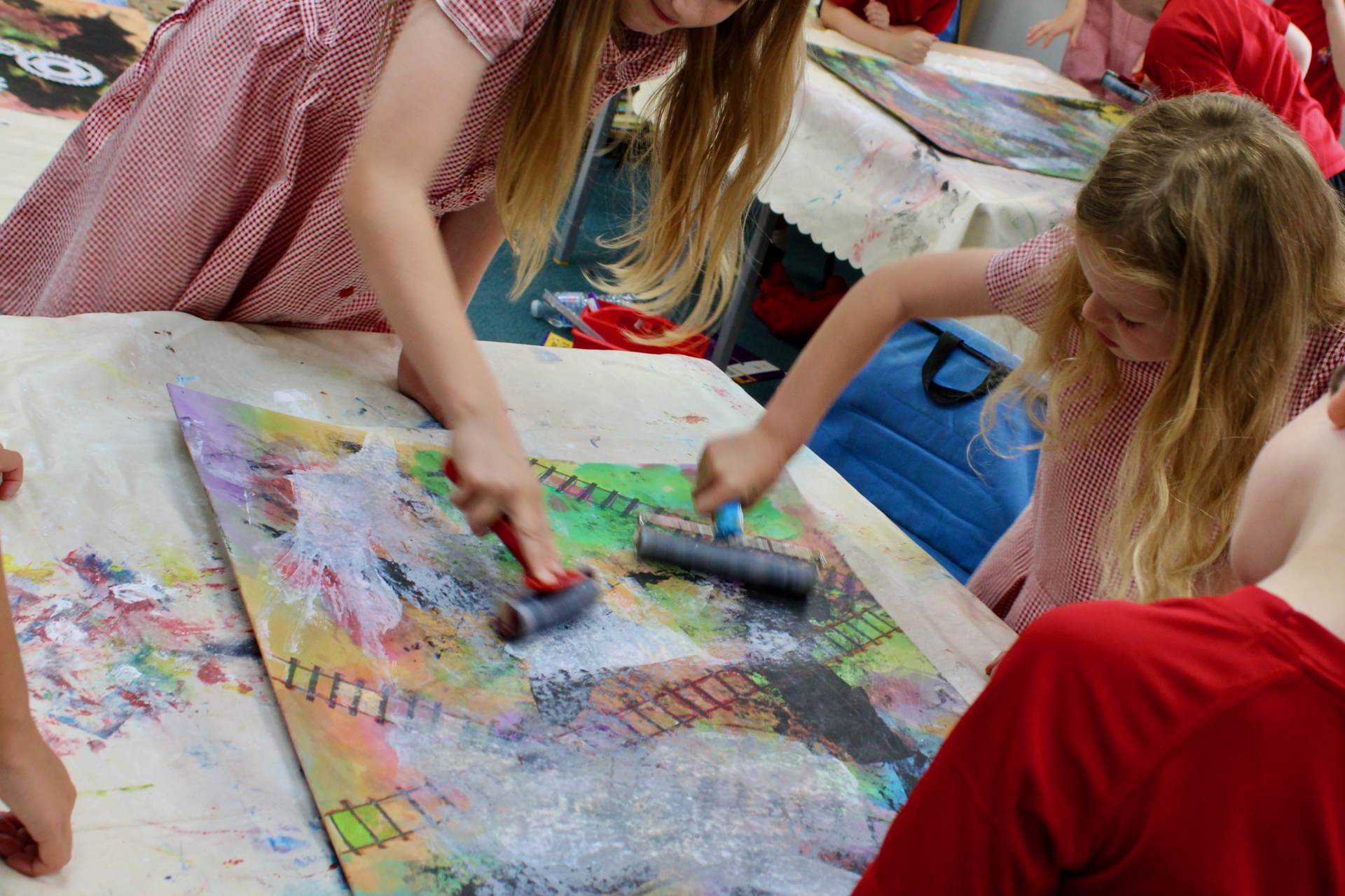 Class 2 pupils took inspiration from American pop artist Jim Dine, known for his expressive depictions of everyday tools and mechanical objects. Their work focuses on the inner workings of train engines - gears, bolts, levers, and pistons - transformed into bold, colourful compositions. This exploration of machinery not only taught pupils about engineering but also encouraged them to view mechanical parts as art forms in their own right.