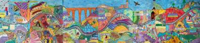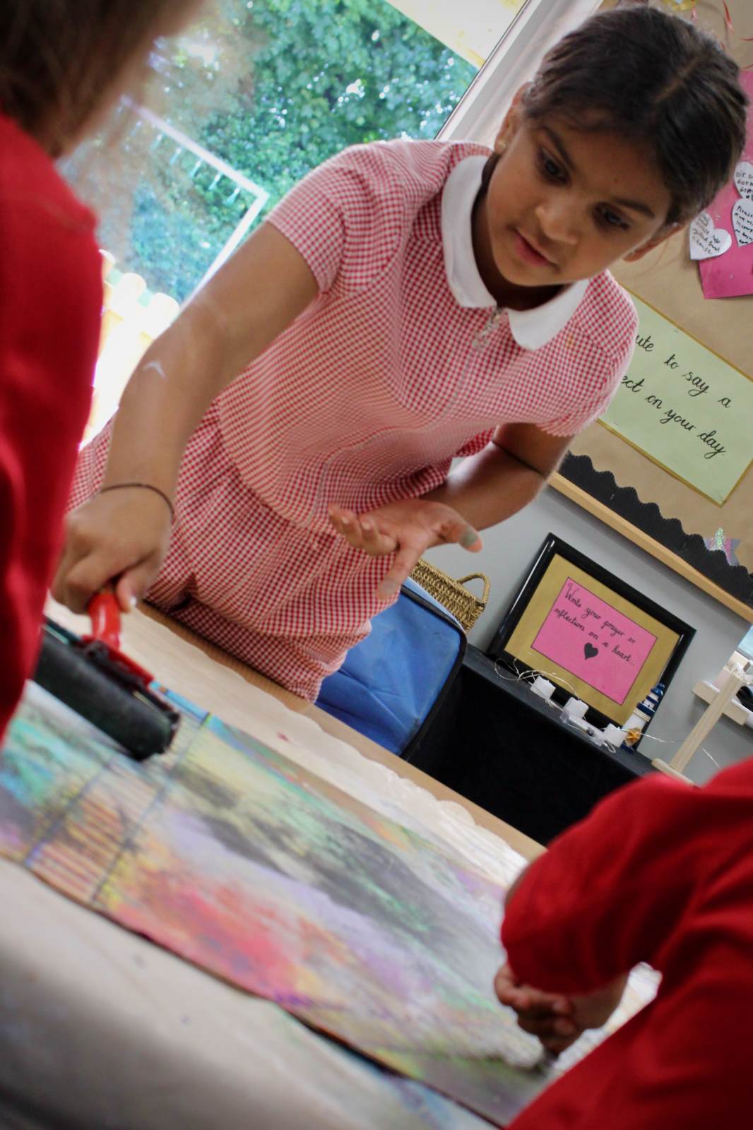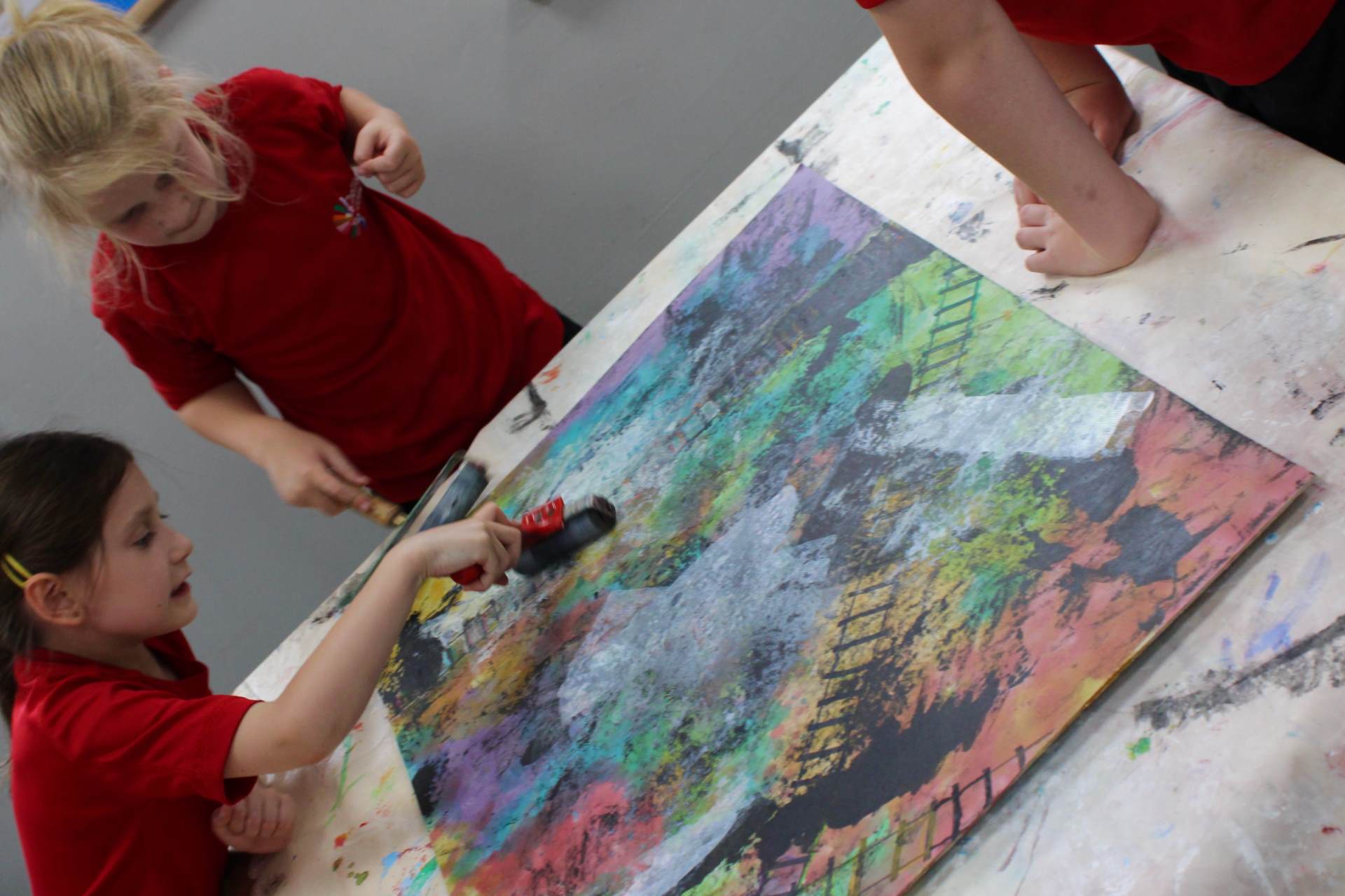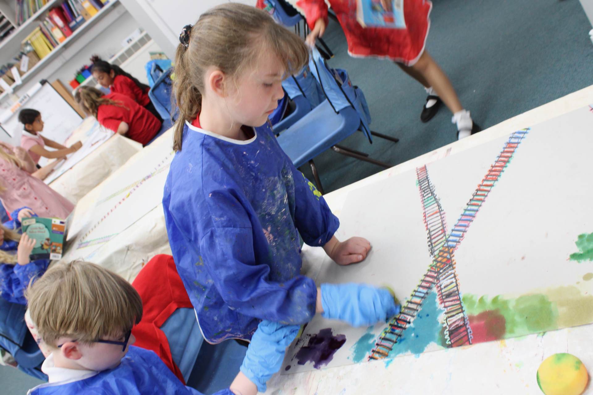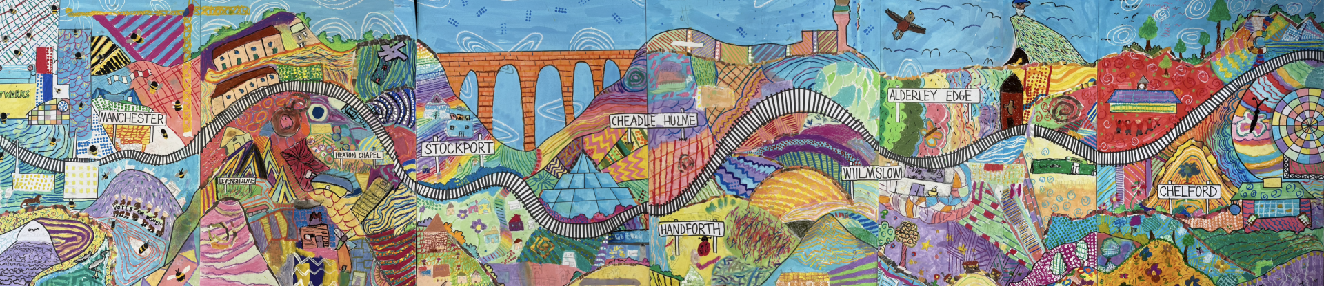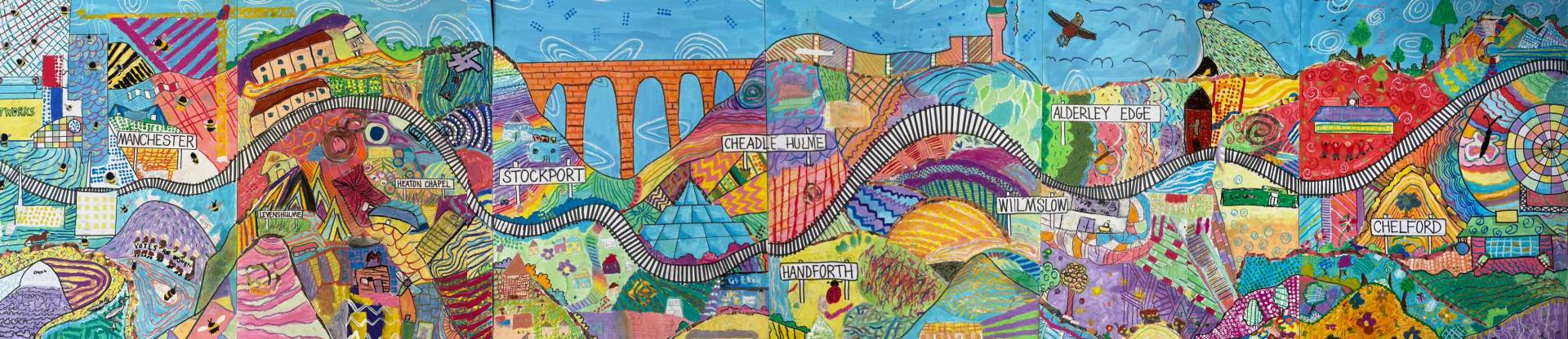 Class 3 pupils created a collaborative mural inspired by the landscape studies of David Hockney, particularly his use of perspective, vibrant colour, pattern and texture. Their piece represents the journey between Manchester and Chelford, reimagined through the eyes of our young artists capturing local landmarks, rolling countryside and moments of travel. The mural reflects both the physical journey and the imaginative experience of travel, viewed through a contemporary lens.