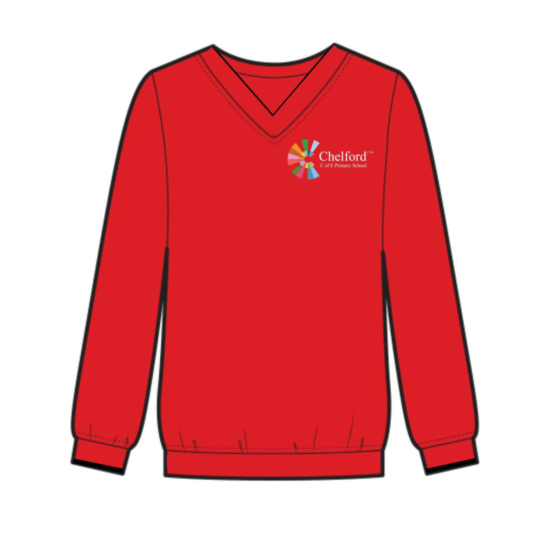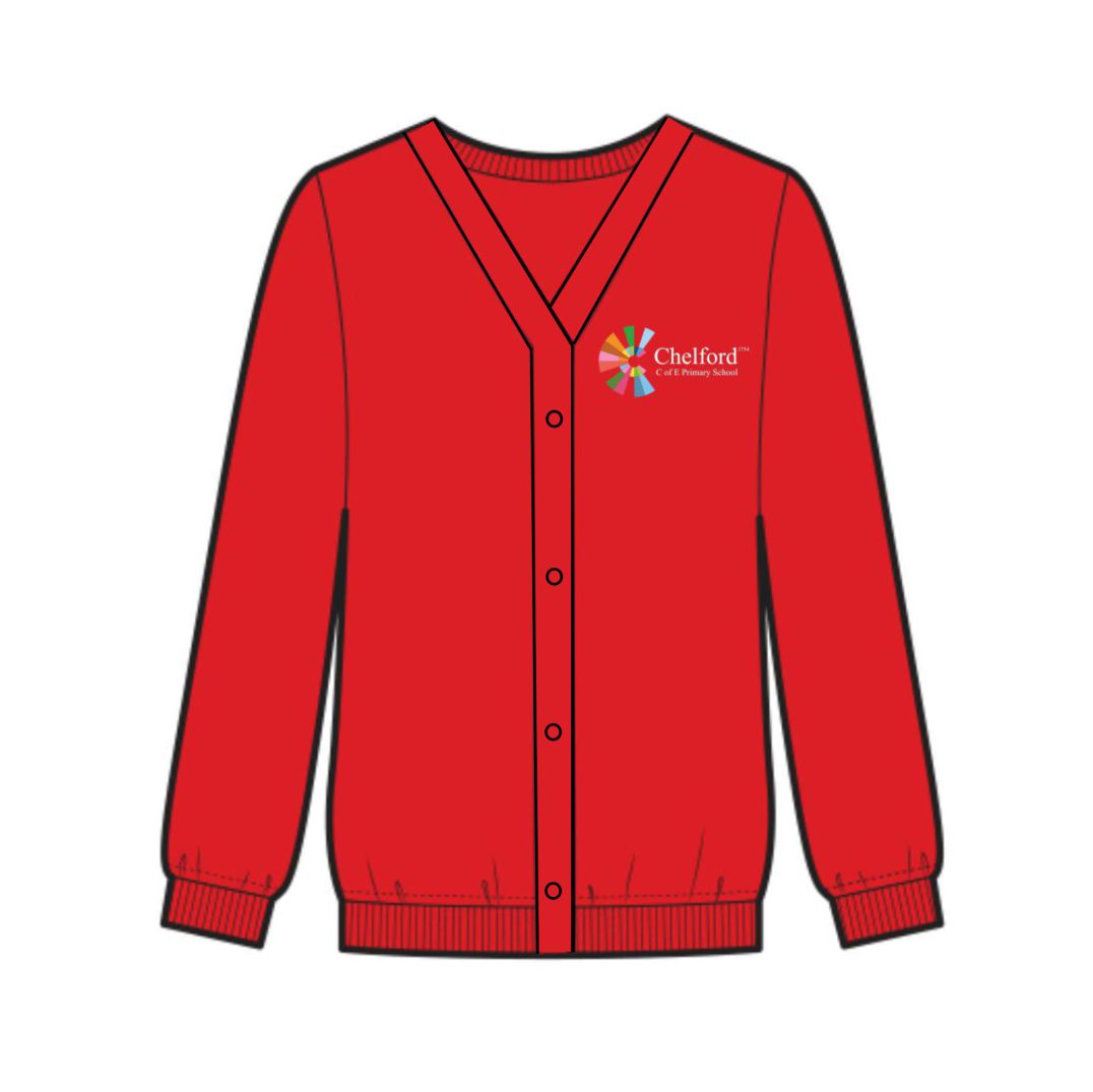 - Red v-neck knitted jumper / cardigan with embroidered School logo